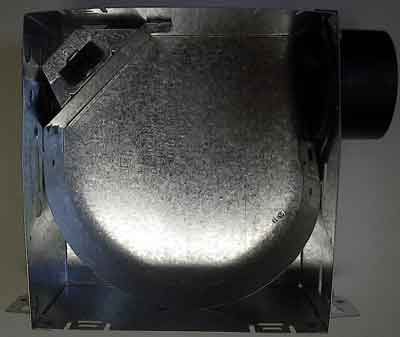 - Install new ventilation fan/damper assembly into existing fan housing. Line up the opening in the plate with the outlet in the housing. Insert the two divider plate tabs into the slots in the housing and pivot the fan/damper